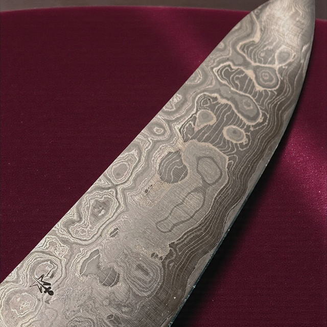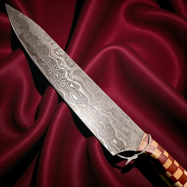 Dieses Messer ist ein Meilenstein in der handwerklichen Evolution des Sternenschmieds: knapp drei Wochen Arbeit stecken in diesem Messer, bei dem es dem Schmied gelang, eine neue Handwerkstechnik zum ersten Mal erfolgreich anzuwenden. Und da das Schmieden der Klinge ohnehin bereits absurd lange dauerte, verlieh er diesem Messer noch zusätzlich einen ganz besonderen Griff aus Ahorn- und Birnenholz.